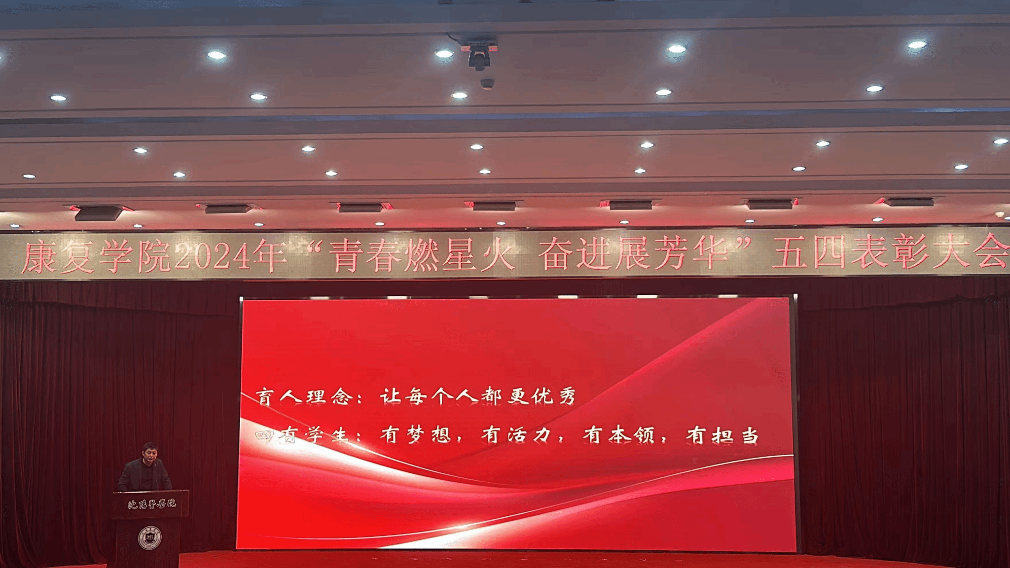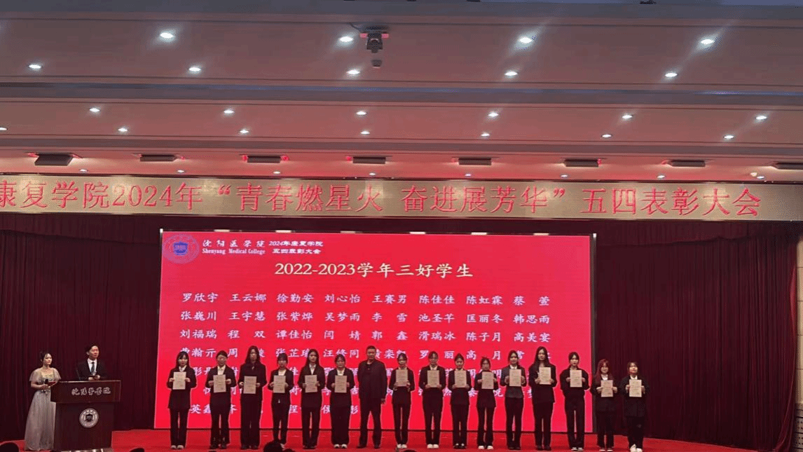会议颁奖环节共分为“善学”、“卓越”、“担当”、“笃行”四个篇章,涵盖“学风标兵”、“优秀团干部”、“考研先锋奖”、“优秀青年志愿者”等12个奖项,从不同维度表彰在2022-2023学年中表现突出的优秀学生,强化其在责任担当等方面做出的贡献,四个篇章的优秀学生代表分别进行了事迹分享,鼓舞康复学子接续奋斗,再创辉煌。为弘扬志愿服务精神,颁奖环节后,由优秀青年志愿者领誓中国青年志愿者誓词,感召、带动学生加入志愿服务队伍,用心、用情、用力做好志愿服务工作。