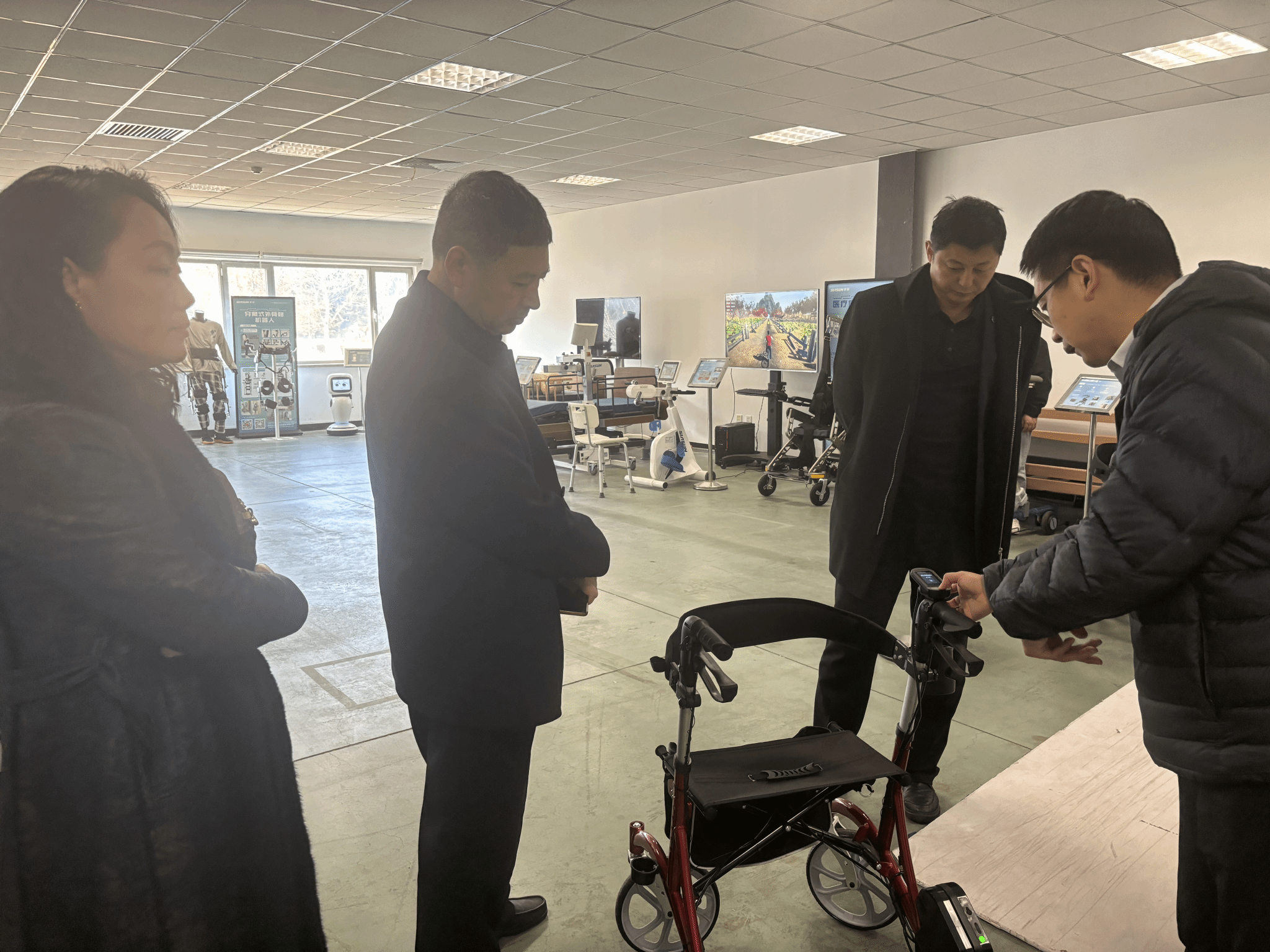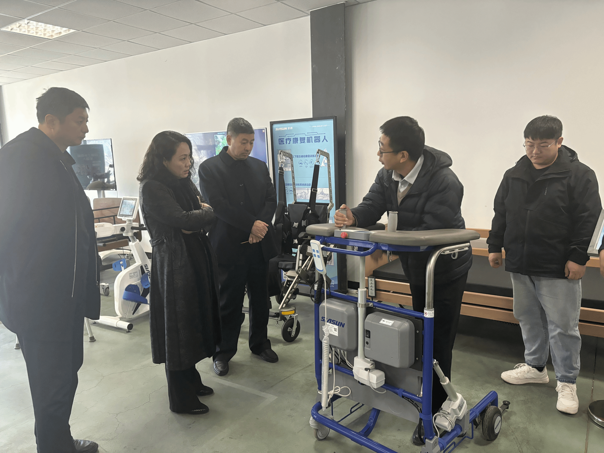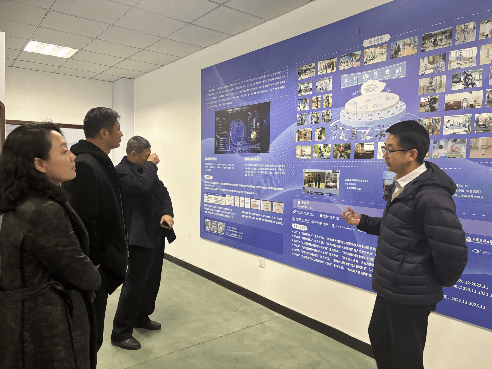 新松公司医疗与服务机器人事业部副总经理陈禹希,行业经理李起越介绍了医疗健康机器人事业部的发展历程,获得荣誉以及获得国家科研项目情况,共同参观了新松三期参观新松智慧康养机器人展厅,新松智慧产业园展厅。