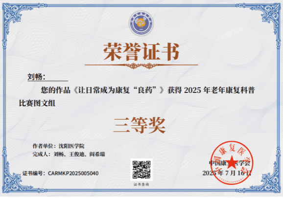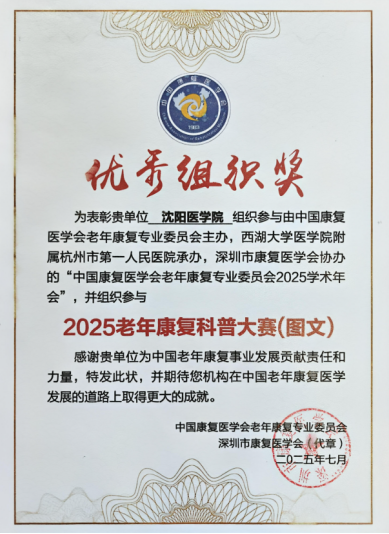 2025年7月12日,由中国康复医学会老年康复专业委员会主办、西湖大学医学院附属杭州第一人民医院承办的2025年老年康复科普大赛决赛在杭州成功举行。经过激烈角逐,WilliamHill刘畅、王俊迪、阎希瑞三位同学组建的沈阳医学院代表队凭借出色的表现,斩获大赛图文类三等奖,沈阳医学院荣获优秀组织奖。