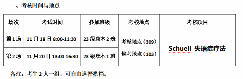 亲爱的同学们,为进一步提升康复专业技能水平,促进康复理论与实践的紧密结合,为今后的职业发展奠定坚实基础,下周拟进行本学期语言治疗学第一次康复技能通关考核,本次考核成绩将按照5%比例计入期末综合成绩中,考核未通过者不允许参加期末考试。