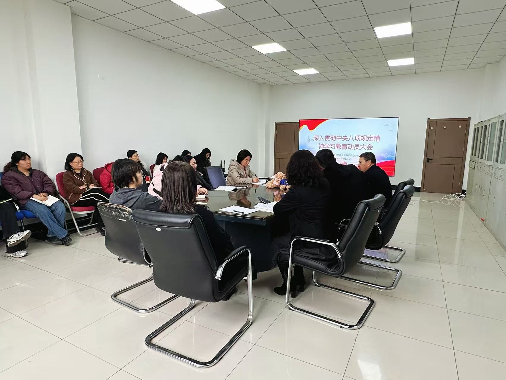 会上,周东升书记传达了上级关于深入贯彻中央八项规定精神学习教育的相关要求,着重强调此次学习教育从全国两会后至 7 月开展,意义深远。他对学院开展学习教育作出具体安排:强化理论学习,通过专题学习、警示教育等形式,深刻领会中央八项规定精神的内涵和要求;严格自查自纠,对照作风建设要求,查找工作中存在的不足,立行立改;完善长效机制,将学习教育成果转化为制度规范,推动作风建设常态化、长效化。